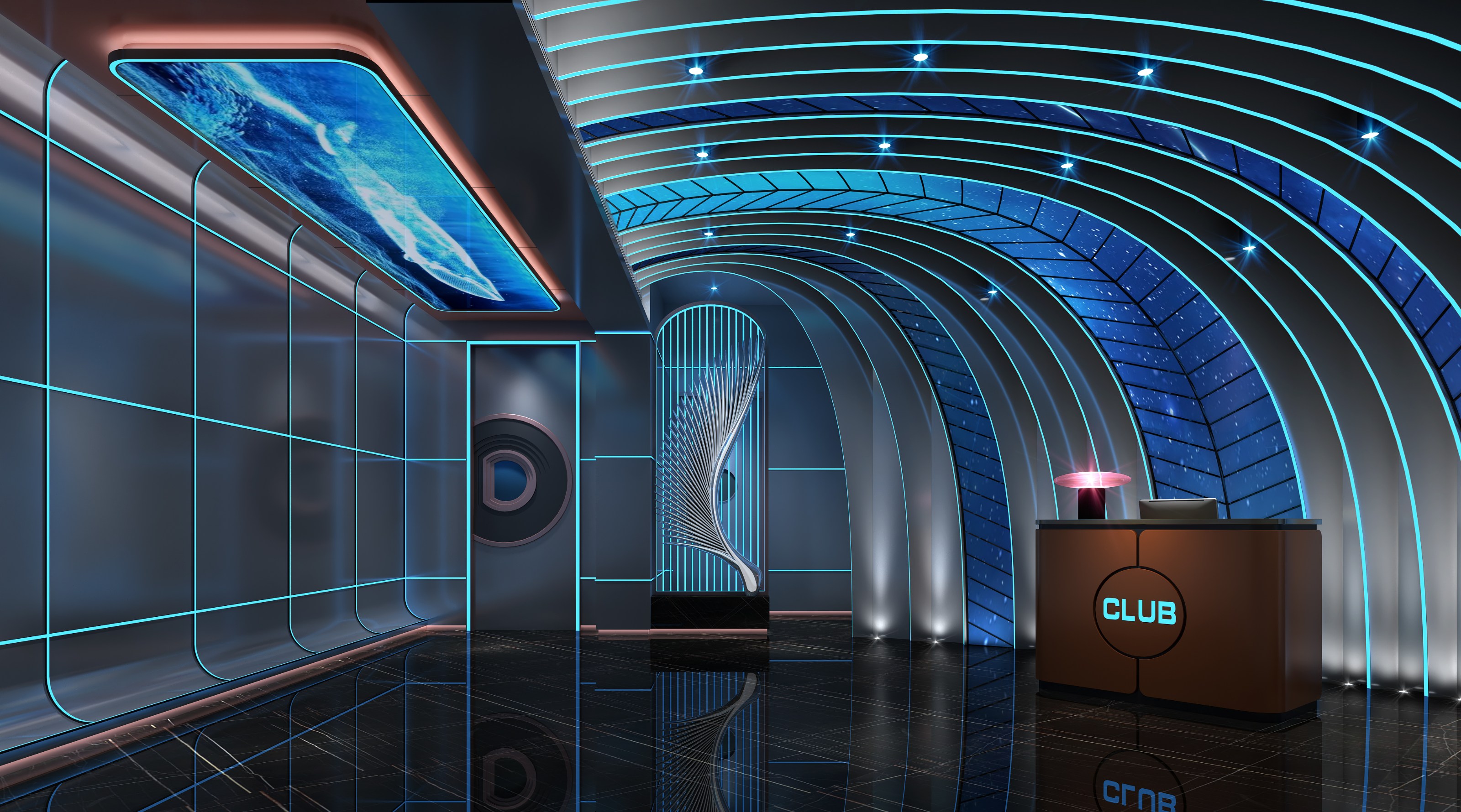 派对房设计采用大片不规则荧幕搭配上大面积蓝白灯带、金属质感银色建材,将其打造成一个位处海底世界之中的蓝色奇幻空间。通过派对房内音乐灯光和荧幕上海底之景的变幻,让消费者的全部感官在不知不觉间全方位地沉浸在设计师精心布置出来的海底世界中。