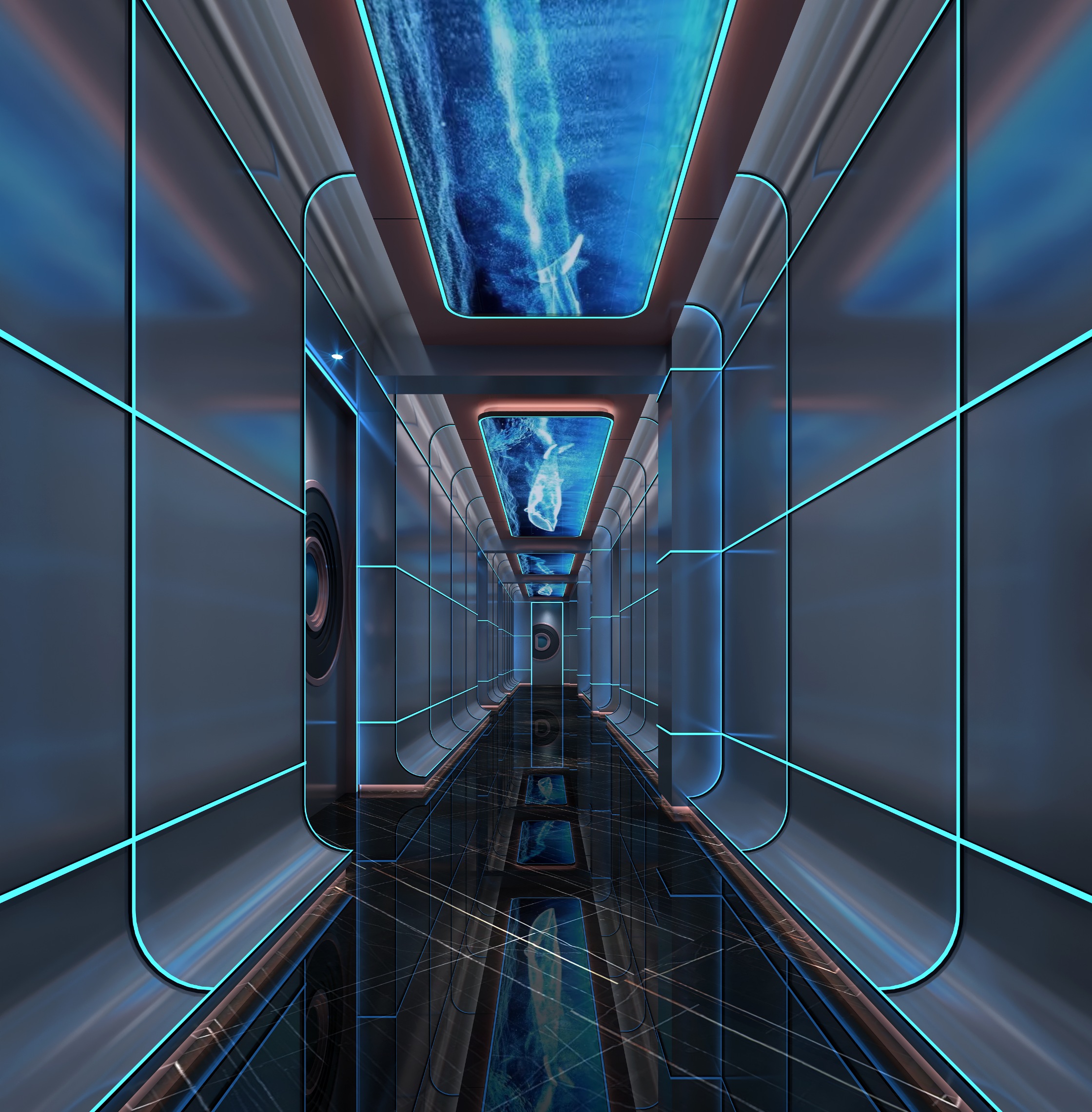走道设计依旧延续前台接待区风格,两侧墙面用平整圆滑的银色金属色泽建材作为铺垫,其上布满排列有序的蓝色灯带,吊顶的每个间隔区域均采用一整块凸显海底天然景观的灯牌,用这种挤满眼部视线的方式让消费者沉浸在由设计师一手构建出的海底世界中。地面设计选择光滑的大理石板,能最大程度的映射墙壁灯光和吊顶灯牌景色,让整个走道空间更加和谐统一,融为一体。