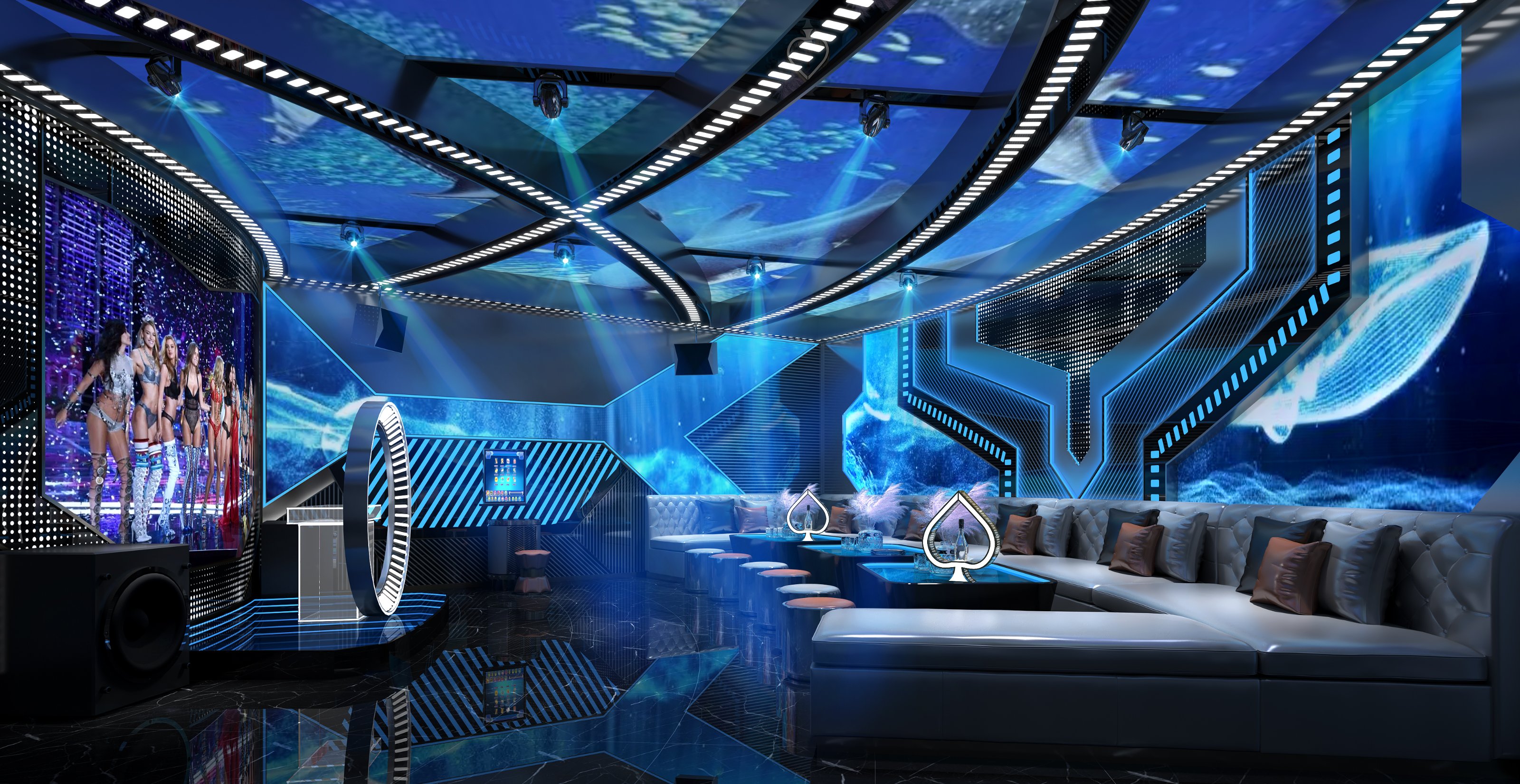 旧场翻新需要设计师在已有的设计框架内推陈出新,在旧的框架中呈现出新的设计,这要求设计师拥有更多对于装修设计的灵活见解和奇思巧想。本案湛江派对KTV就是其中典范,看设计师是如何运用点线面与现代科技结合,将一个碧波荡漾的海底世界呈现在大家眼前。