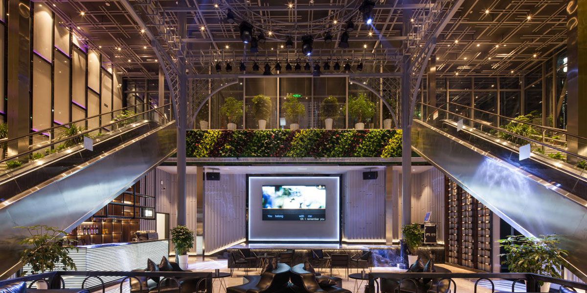 娱乐大厅空间是整个设计的重点,设计师匠心独运,别致的设计瞬间吸引眼球,体现出简约奢华的极致品质。以小舞台为中心,左右两侧墙壁运用线条营造出动态效果,蜂巢图案装饰的背景墙明暗结合,组合成蝴蝶造型,展开布置造型简约的卡座,凸显对称之美,成为空间设计中的亮点。吊顶则充分利用层高的优势,舞台灯光体系与垂吊的球形吊灯组合安装,并以小射灯点缀,将整个空间装点的漫天星光,营造出时尚浪漫、简约奢华的空间氛围,随时随地变成华丽舞台。