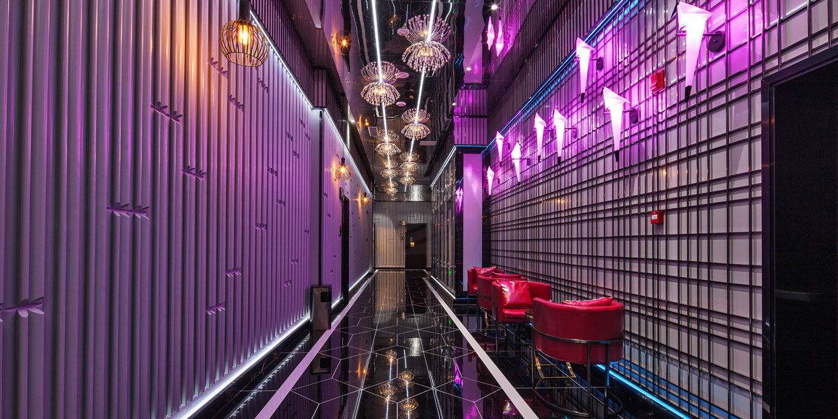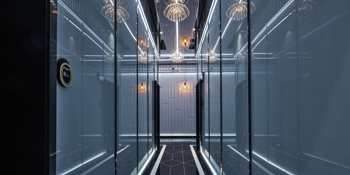 前厅和前台空间的设计,凸显出设计师的不凡功力,将暗调风格演绎的淋漓尽致,彰显国际风范。整体设计采用黑、灰、白的高级色调,并大面积采用了镜面材料,组合搭配出设计的轻奢质感。前台采用矩形石材台面,通过灯光设计勾勒出通透的效果,上空悬挂红色灯具,成为空间内*闪耀的颜色,醒目亮眼。前台对面的位置设置了酒品置物架,同时起到分割空间的作用,暗埋的LED灯带营造出时尚质感。空间内的承重立柱以白色圆弧装饰,形成凹凸的里面造型,地面采用明暗渐变的板材组砌,映衬在镜面材质的吊顶上,形成明暗结合的倒影,增加了空间的层次感,仿若进入百花筒中每个角度都有不一样的精彩。