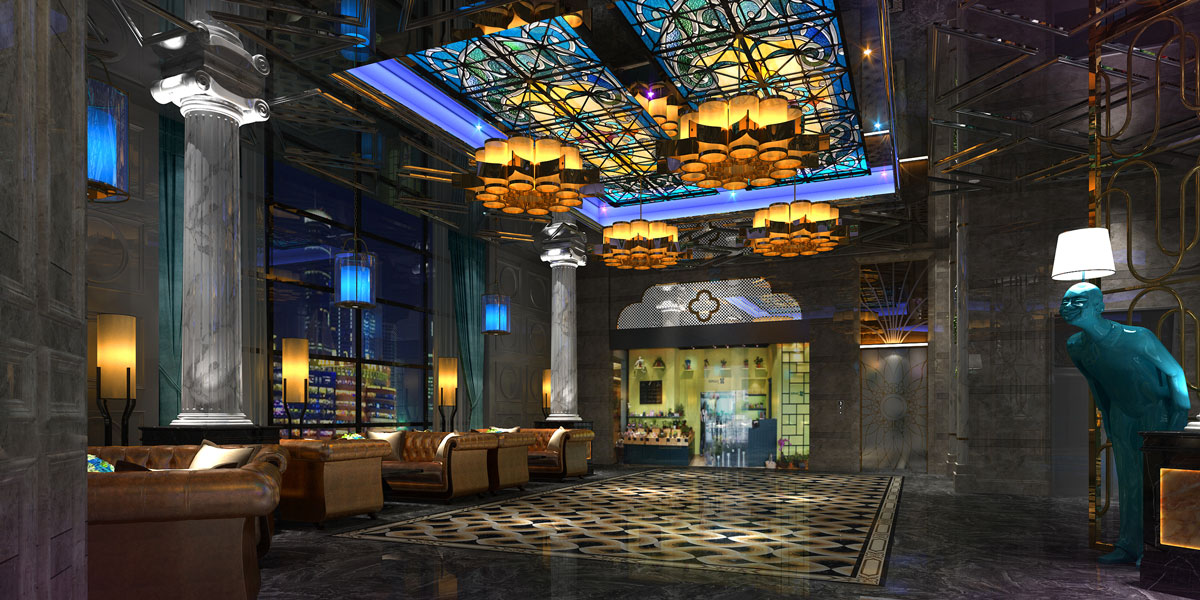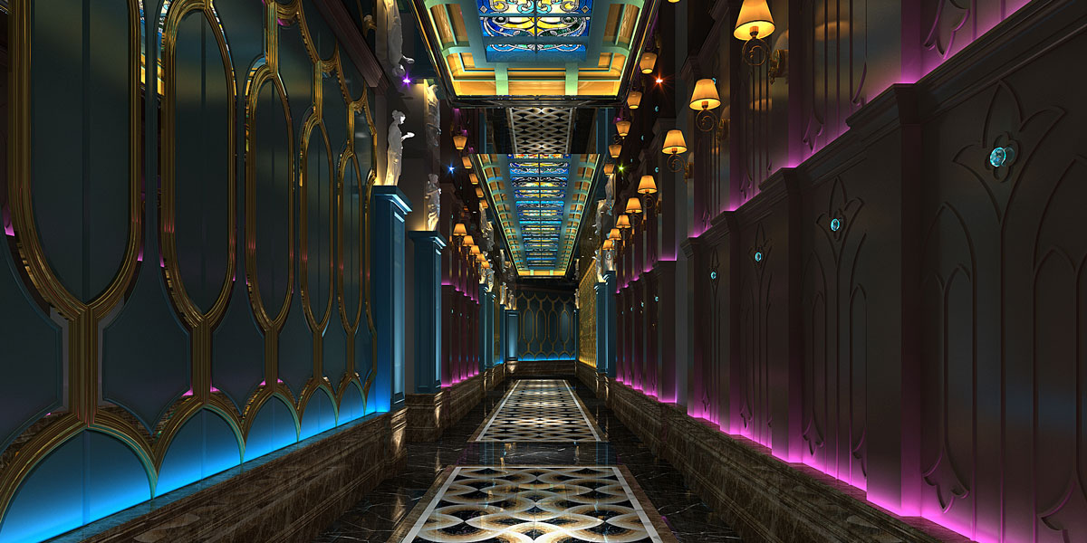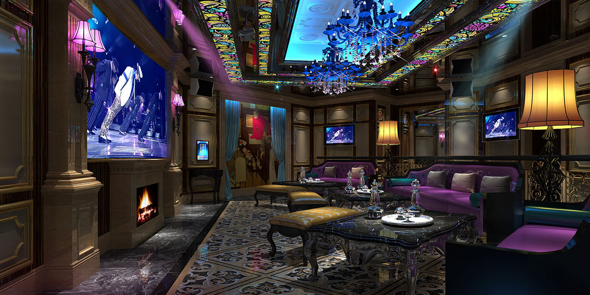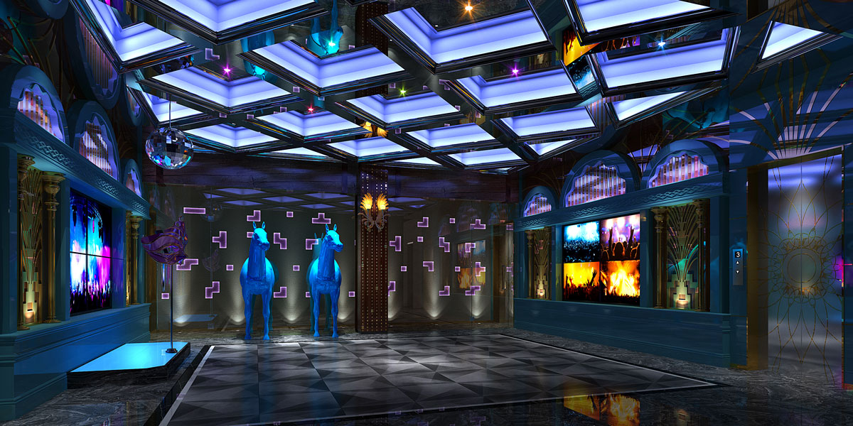 包间设计更为大胆,有的房间充满科技感,有的房间则主打梦幻色彩,不同空间散发出不同的诱人魅力。主打科技感的包间,创新性的将3D视觉效果元素融入到室内设计中,墙壁高清大屏,图像清晰,吊顶块状设计,完美结合,能够呈现出不同的视觉效果,一进去房间就仿若进入到海底世界,效果逼真,如梦如幻,带来超3D的全新感官体验,科技感十足。互动舞台空间通过灯光设计,营造出梦幻的氛围,吊顶设计中采用矩形几何体分割,内衬LED灯带,墙壁镂空位置暗埋小射灯,与大面积的高清大屏形成完整的灯光体系,变幻的灯光中仿佛进入魔方世界,效果震撼。主题大包间则将中西融合这一概念演绎到极致,选用蓝色紫色为主色调,点缀传统中国红,色彩高贵典雅,装点上精致的壁画,和谐统一。另一包间则将罗马柱作为空间的主要元素,装点彩色玻璃,将整个房间打造成为一幅油画,凸显出尊贵品位,典雅气质。