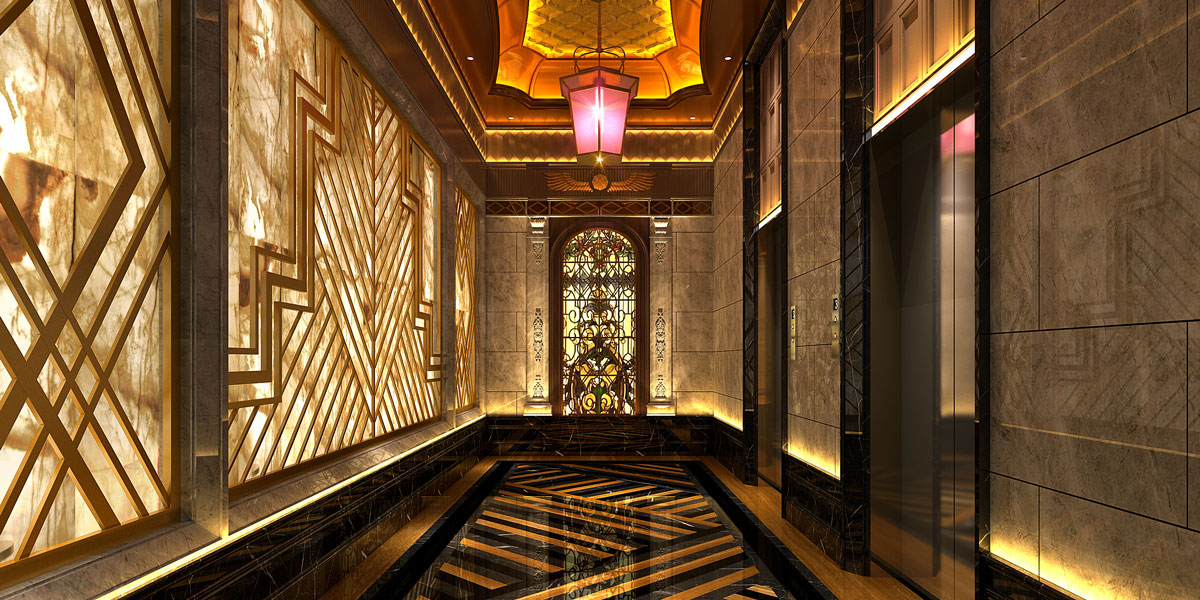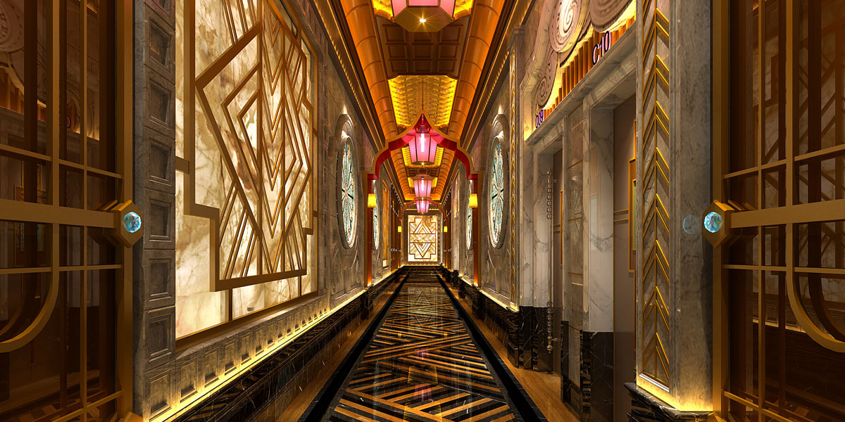 进入大堂,奢华典雅的气质铺面而来,水晶吊灯首先目入眼帘,不锈钢吊顶天花映衬拼花地面,大理石墙面配合玻璃装饰饰面,以金属装饰饰物为点缀。电梯入口,欧式柱体配合雨棚造型,黄色灯光,温馨典雅。来到过道,透光云石墙面格外抢眼,欧式雕花的运用独具匠心,搭配彩色玻璃装饰。六边形宫灯点亮造型天花,内藏LED暖色光源,提升空间氛围。地面斜拼地砖,褐色和黑色的搭配,为空间注入几分稳重的气质。