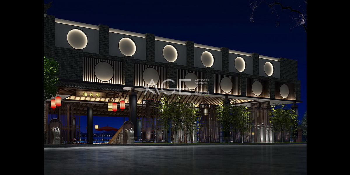 本案作为主题酒店设计,周边环境优美僻静,设计师秉承“因借环境、融为一体”的理念,以中式园林的思路精心打造,临水而建,依木而起,目光所及之处都是令人心旷神怡的风景,这也成为本案空间设计中*大的亮点。商务酒店的外观设计,以广东中山地区*常见的建筑风格为主,融入岭南建筑中的“镬耳屋”、“天井”、“碉楼”、“骑楼”等建筑元素,外墙壁以典型的清水墙作为装饰,以突出墙面的立柱进行分割,青砖为基础,白色石灰勾缝,并设置多个圆形图案,内置氛围灯带,整个外观古朴素雅,别具韵味。
