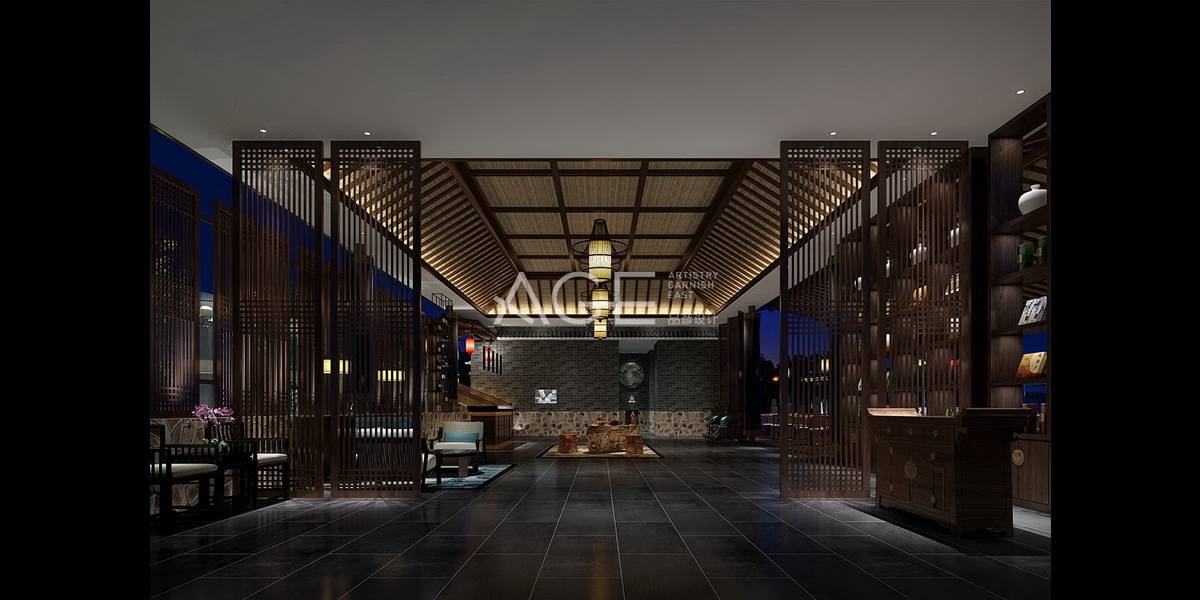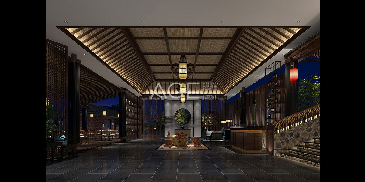 一层设置为开敞式的公共区域,计师采用通透性的设计原理,外延设置了超大空间的室外平台,*大限度的发挥每个空间的功能。入口处采用了立柱与挑檐,并用图案精致的砖雕压顶,悬挂喜庆的大红灯笼和牌匾,充满浓郁的中式风。大堂空间采用中式屏风造型的隔断进行功能空间的划分,可以看到窗外的绿竹和山水,营造出似透非透的朦胧美感。吊顶借鉴了穹顶设计,利用了大量的木龙骨进行搭建,依次排列,整齐规整,与中式屏风隔断相互辉映,构建出整个大堂的立体空间,细节处摆置的砖雕、木雕、石雕灯充分代表中山文化的艺术精品,配合灯光效果,诠释别样的新中式之美。