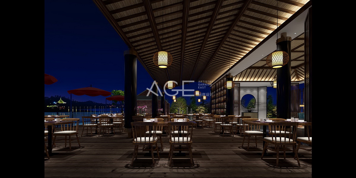 外拓平台空间充分发挥视野开阔、景色优美的优势,主要作为休闲区和就餐区。吊顶设计与室内大堂一脉相承,利用排列组合的变化形成自己的特色,吊灯选择简约的网格灯,整齐排列的餐桌椅,红色遮阳伞,柔和的灯光点缀,简单不单调,幽静而舒适。