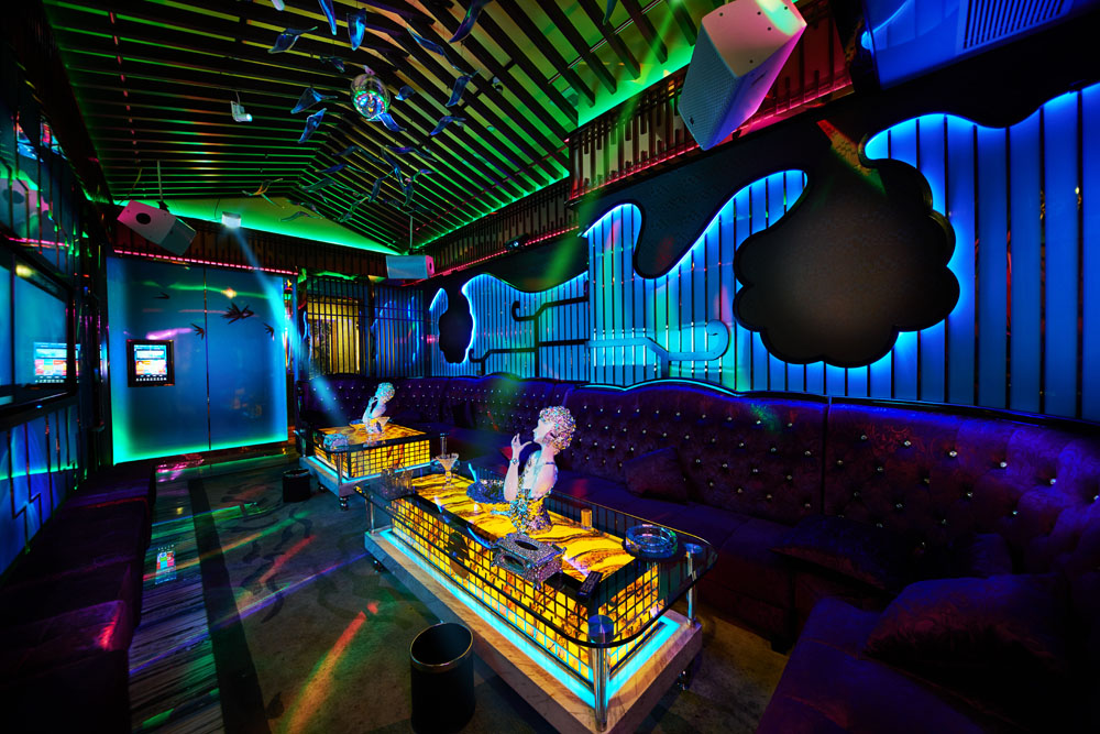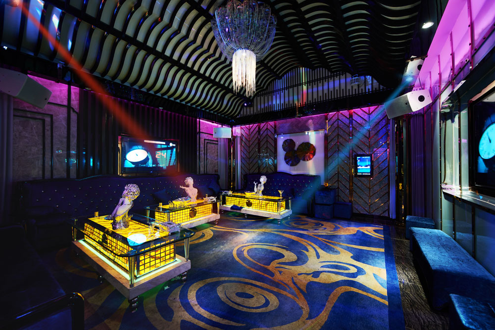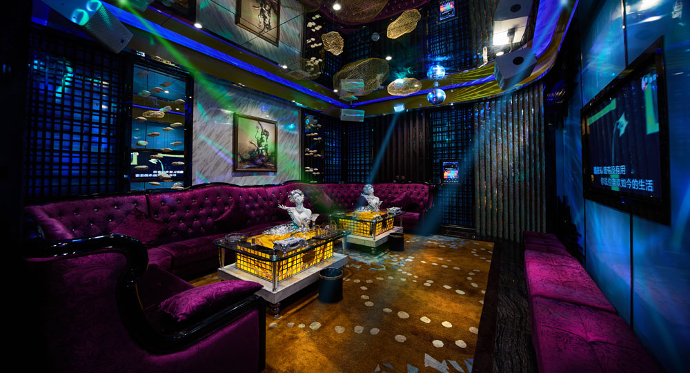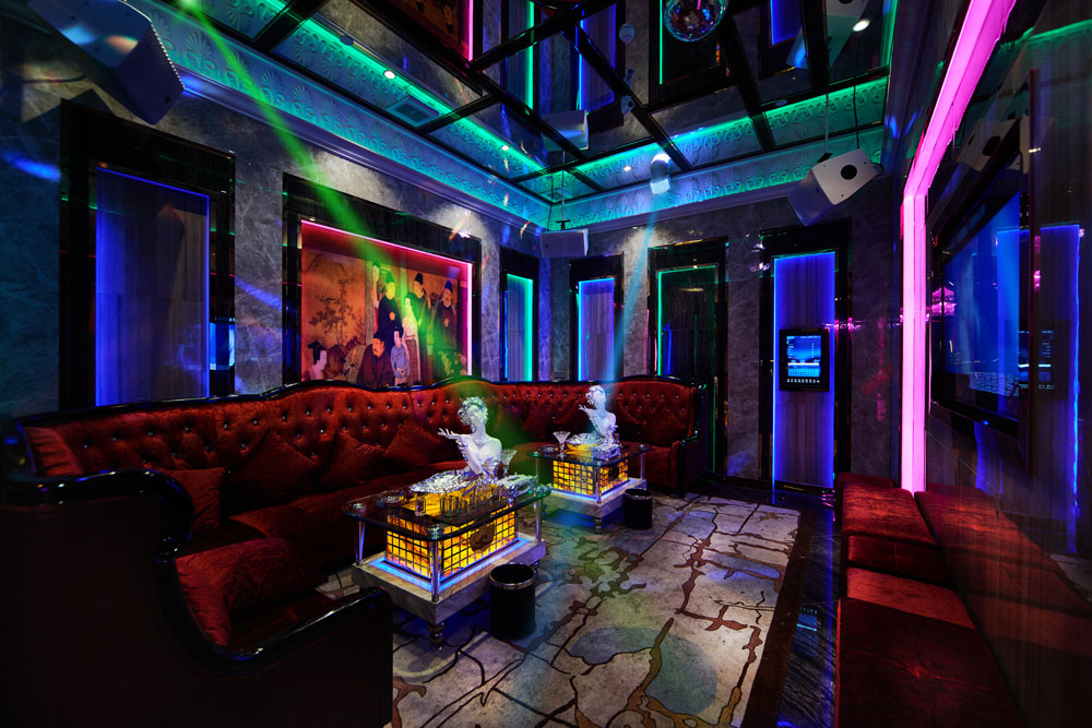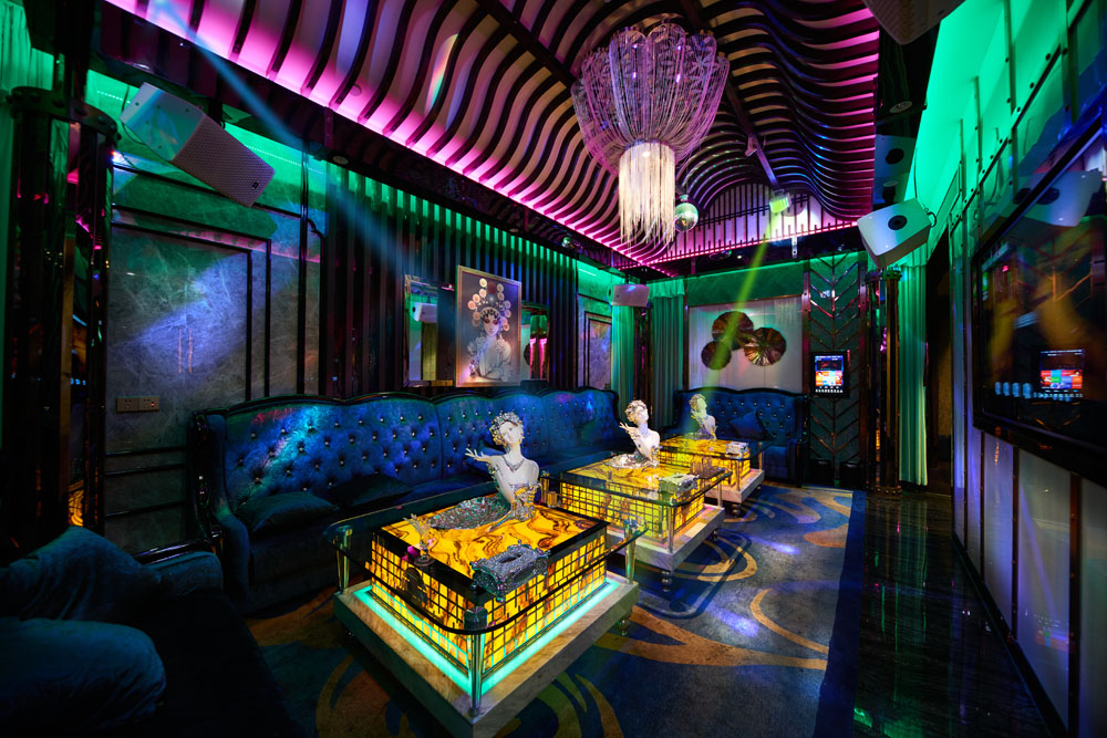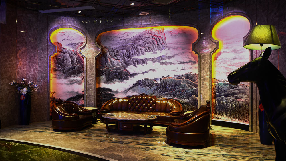 墙面隐约可见的竹叶,朦胧诗意;用极简的弧线造型勾勒的皇家龙椅线条透露出设计师的“小心机“,摒弃了繁复的家居装饰,节约成本又能呼应空间;山水书画、宝蓝冰裂釉墙面与青花瓷台灯相互呼应,优雅大方;粉色帷幔下的唐代侍女图,简化线条的欧式古典丝绒沙发与极富时尚现代感的光影紧密相连,为雅致空间提供别样的娱乐化细节。