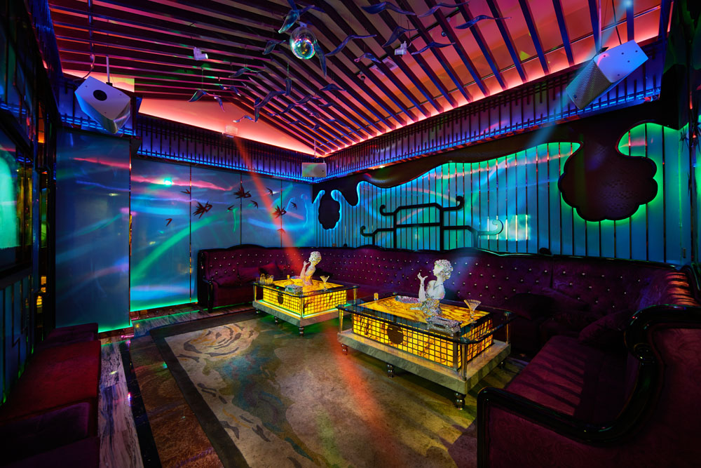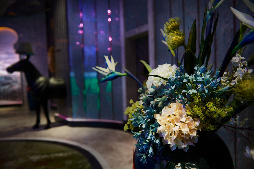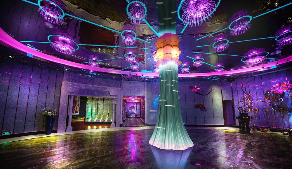 象征“高升”与“如意”的“祥云”、蕴意吉祥的“荷花”等装饰元素与刚硬的玻璃镜面材质混搭却毫无违和感,倾流如柱的水浪波涛、击打的浪花、水晶雨帘、