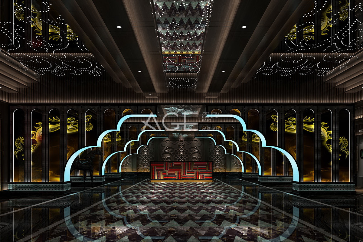 大堂背景墙两侧游龙的图案衬托出龙韵典雅之气,中间背景墙采用精美古典线条使整体层次感分明,前台区域两侧三排独特的立柱的拱形设计,从远处望去有似云雾缭绕的仙境,一展迷离错落有序的美感。高贵奢华的大理石地面与明镜天花板相互呼应的,与前台组合出幻境之美,让宾客仿若感受到偌大空间的古朴典雅,和磅礴生机。大堂设计风格延续完整的造型特色,同时还融入现代科技感的手法,整体设计主题定位于古典式豪华风格。现代科技感与传统设计元素的碰撞和融合,让大堂一入眼帘便给人大气豪迈之感,棕色系和明黄色调的搭配仿佛置身于皇宫当中。