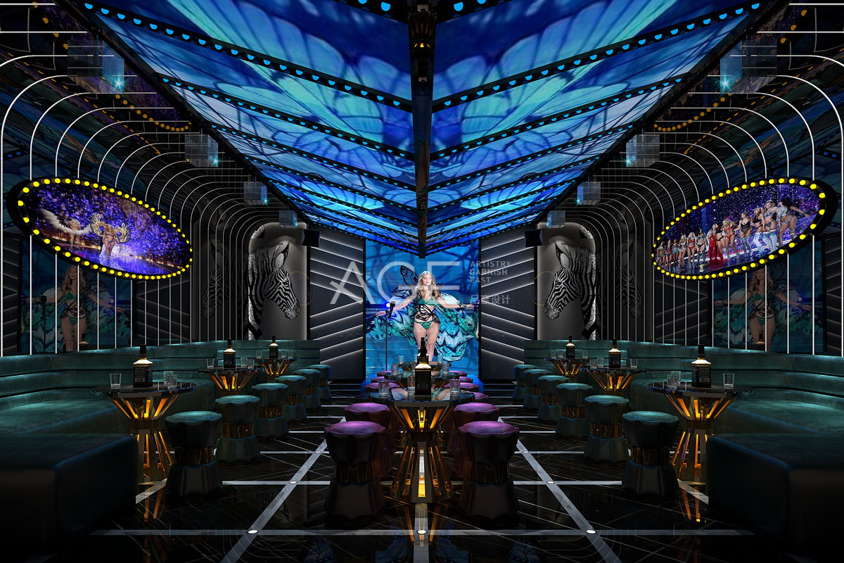派对房设计古风加蝴蝶元素,更有了优雅别致的感觉,天花板用线条勾勒出下坠的感觉,用灯光效果打出蝴蝶样式,下方中间一个小型舞台,墙体设计加入线条元素与天花板相连,分割出下面两个区域,摆放了巨型转角沙发,圆桌式茶几内配上了灯光效果更显好看,中间通向小舞台是小圆桌茶几和小圆凳,给人感觉仿佛置身于T台秀的氛围。
